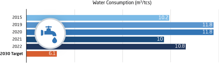 We also monitor the quality of the water we discharge into rivers to ensure it complies with our permits in terms of volumes, pH, temperature, particles of suspended solids, and metals in water. In 2023, we reported a total water discharge of 13.1 million m3 -20.3% from 2012), including 5.204 kg/tcs of metal discharge (+44%% from 2022) and 81.711 g/tcs of suspended solids (-29% from 2022).