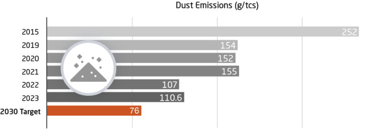 Having achieved our goal of a 40% reduction in ducted dust emission intensity in 2021 (compared to 2015), in 2020 we announced a new target of a -70% decrease and a commitment to reducing diffused (non-ducted) dust. To achieve this, we periodically measure diffused dust to evaluate leakages and identify areas for improvement. We also implemented dust emission improvement plans that focus on either containing, ducting or collecting the dust (in Europe, the collected dust is sent to our Recycling and Renewables Division for recycling). Thanks to efforts like these, in 2023, our total Group emissions was 111 g/tcs.