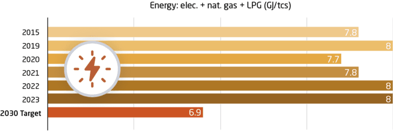 Aperam’s energy mix remains a subject of pride, with 39% coming from renewable charcoal biomass. In fact, renewables now account for 52% of our total energy use which, in 2023 was 13.8 GJ/tcs or 3.8 MWh/tcs2. As for electricity, in 2023, our global carbon footprint decreased in our main countries of operation. In addition to lowering the emission factor of our electricity suppliers, several other actions have had a positive effect, meaning we remain on track to achieve our target of an 11% reduction in