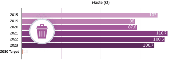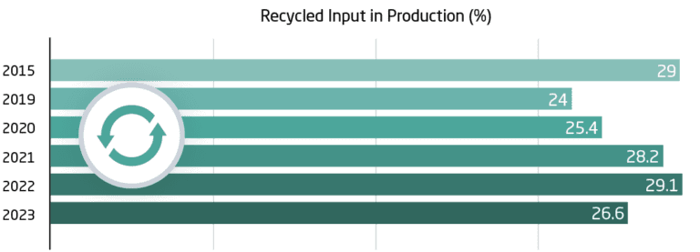 In 2023, just 6.9% of our by-products were sent to the landfill. The remainder (93.1%) is either reused, recycled or stored for future recycling. Our waste recovery ratio stands at 93.1%, with 29% of all our material now coming from recycled sources – including scrap. On average, Aperam’s products, including those made in Brazil (where the scrap market is nearly nonexistent) contain 65% metallic scrap. At our European sites, that figure is 88.5%, with some of our austenitics produced at the Genk facility recording scrap rates of over 95%.